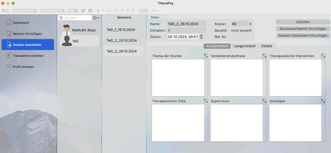 Selbstverständlich können alle Sessions angesehen und bearbeiten werden. Dazu dient das Menü „Sessions bearbeiten“.