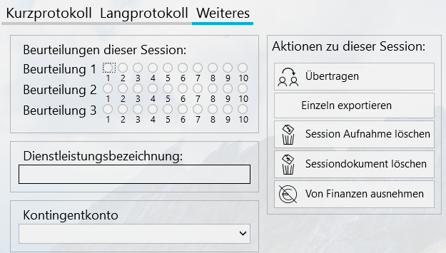 Übertragen: Wenn eine Session irrtümlich zum falschen Profil gespeichert wurde, kannst du sie mit wenigen Klicks zum richtigen Profil übertragen. Dabei wird der Session-Name automatisch aktualisiert, mögliche Audiodateien oder Dokumente werden ebenfalls übertragen. Es wird also die komplette Session inkl. aller zugehörigen Daten und Dateien verschoben.