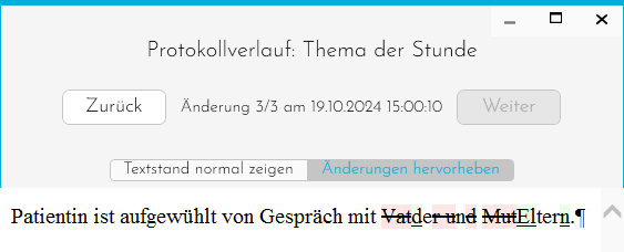 Neu hinzugefügter Text wird dabei grün hinterlegt und unterstrichen, alter Text wird rot angezeigt.Datum und Uhrzeit der Änderung wird festgehalten.